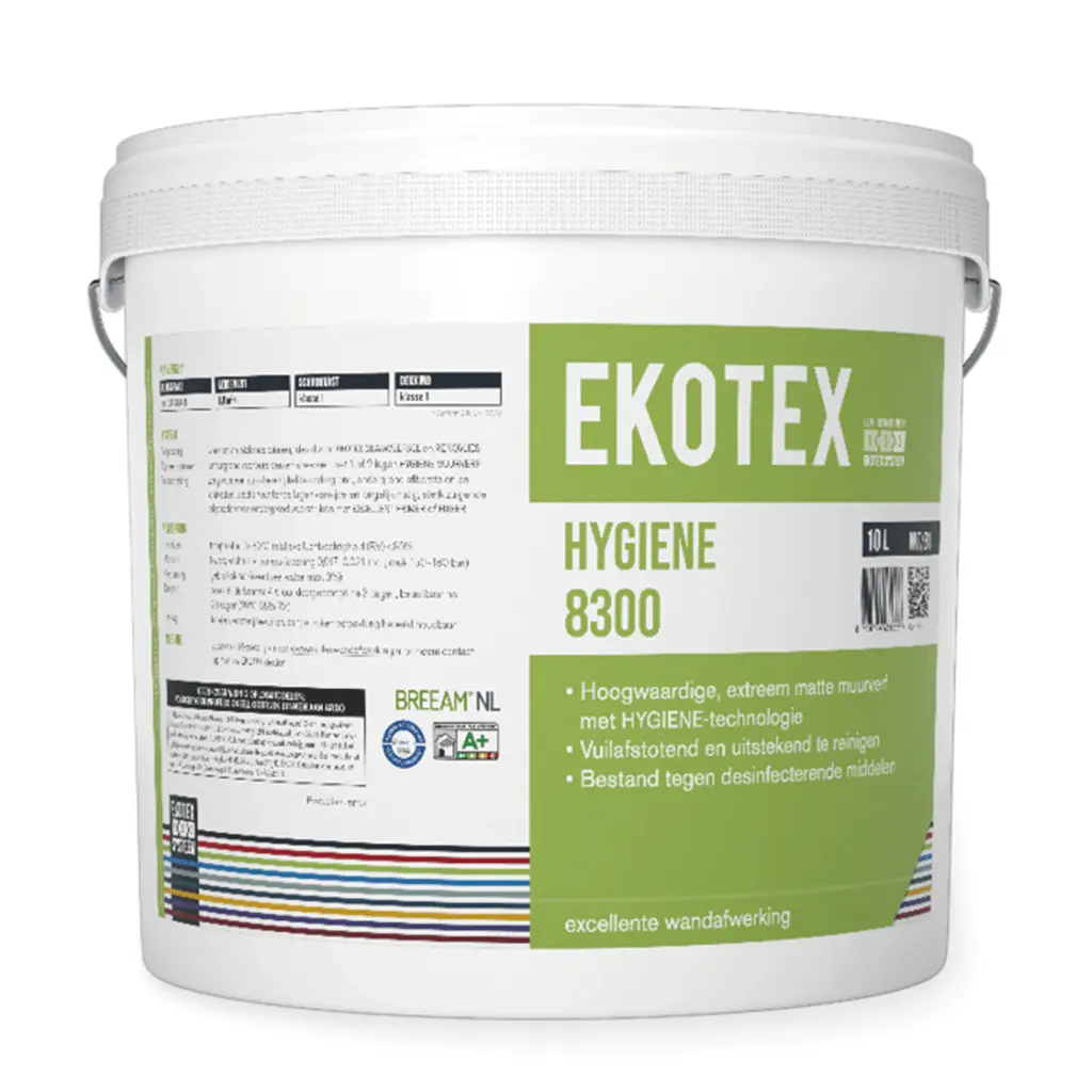 8300 Hygiene 10Ldennis2025-12-29T22:59:58+02:00 EKOTEX HYGIENE 8300 is een professionele, 1 laags premium hygiënische muurverf voor binnen.